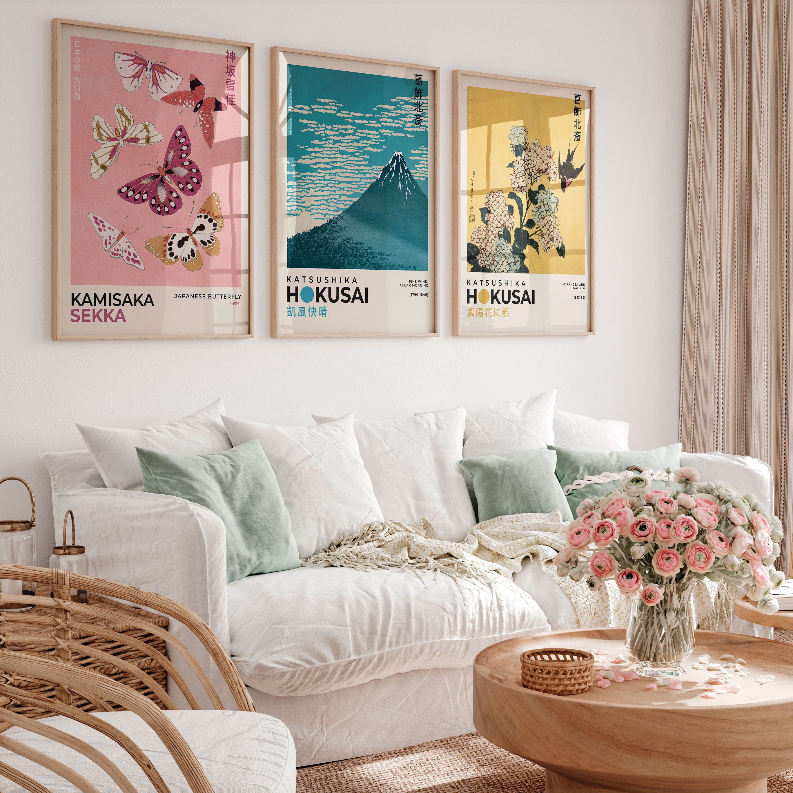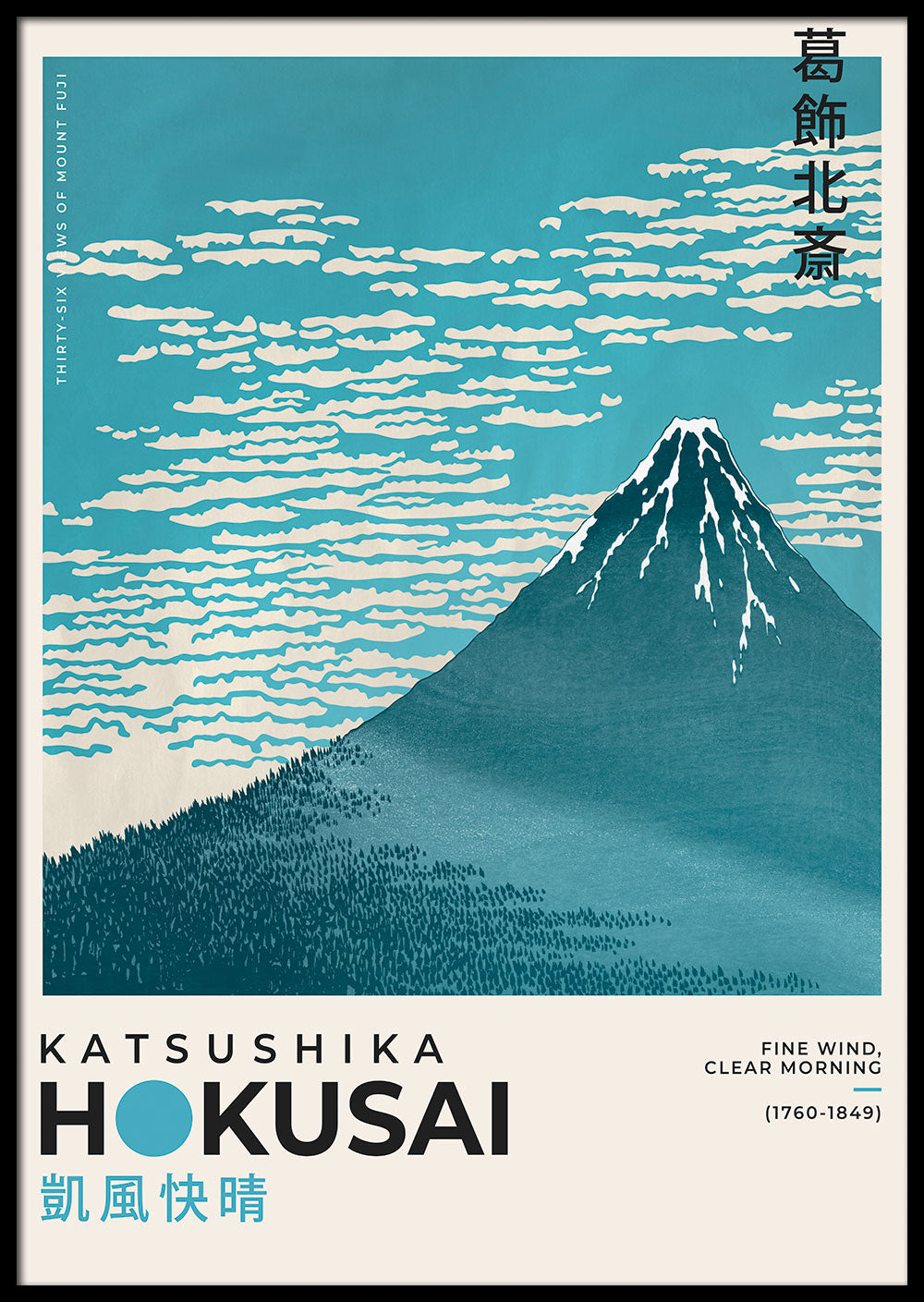 Flot japansk kunstværk af Mt. Fuji med ordene 'fine wind, clear morning' på blå baggrund. Kombiner denne plakat med nogle andre af vores kunstplakater for at danne din helt egen plakatvæg. Husk at du kan tilvælge ramme til plakaten.
