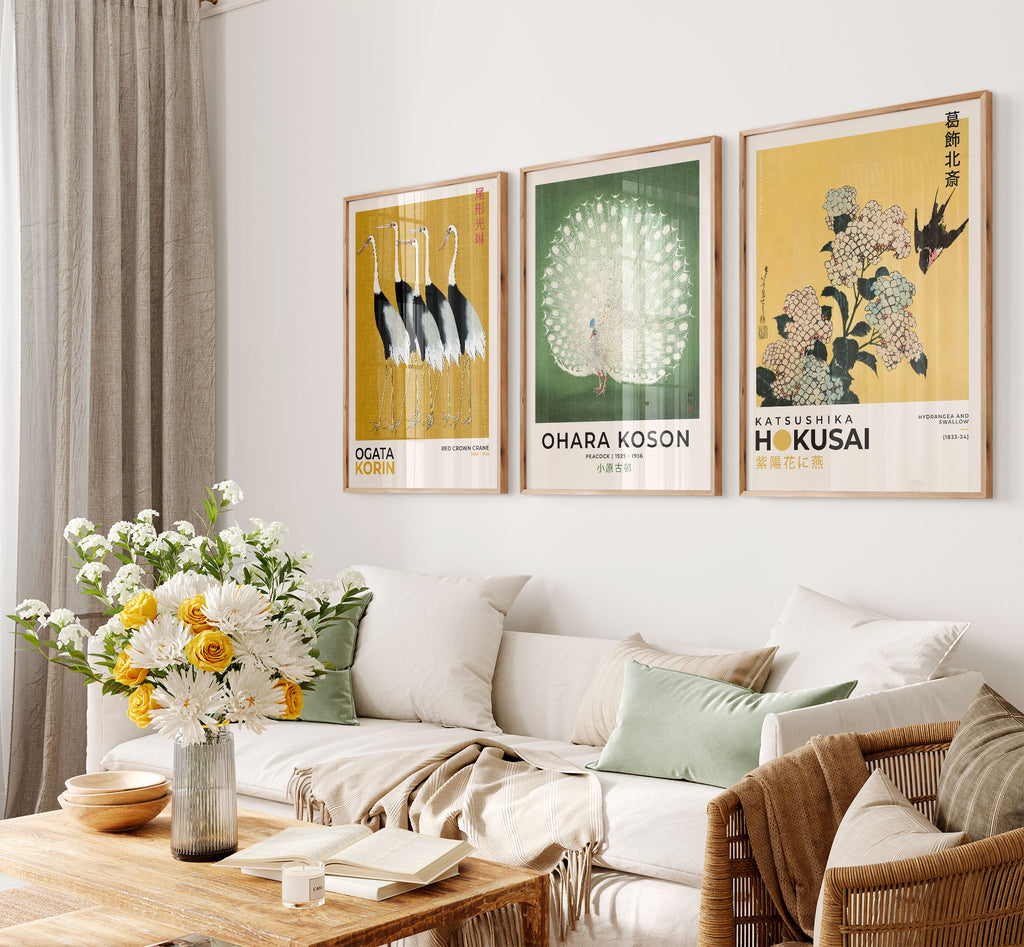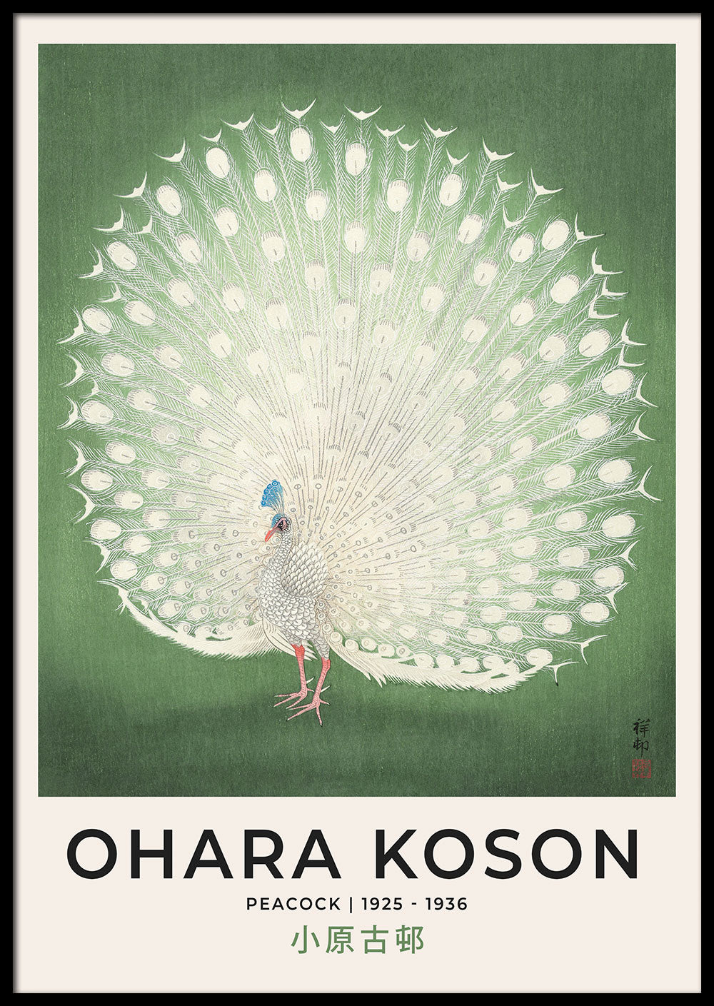 Flot japansk kunstværk af en påfugl på grøn baggrund. Kombiner denne plakat med nogle andre af vores kunstplakater for at danne din helt egen plakatvæg. Husk at du kan tilvælge ramme til plakaten.