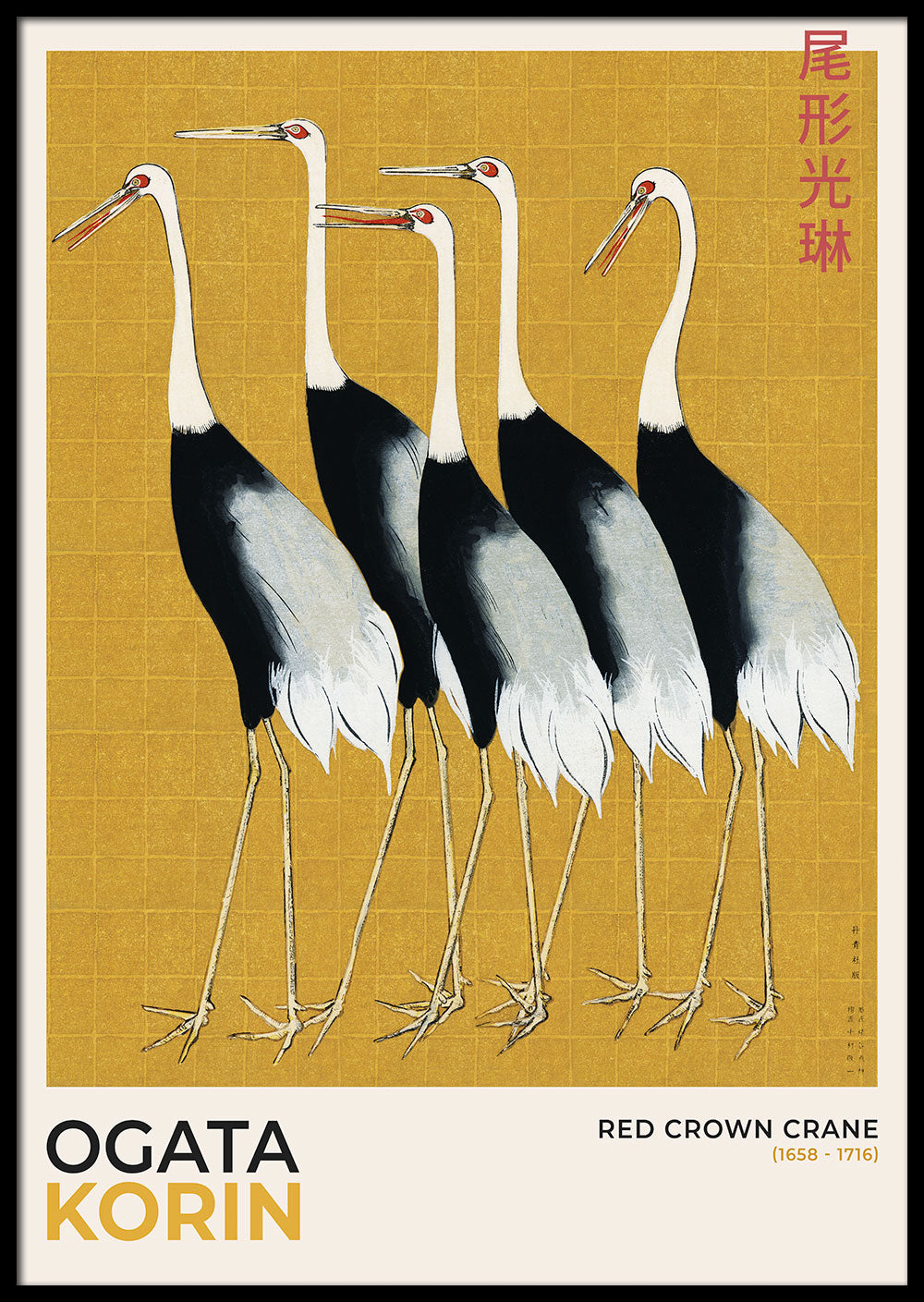Flot japansk kunstværk af en flok rødkronet traner af Ogata Korin. Kombiner denne plakat med nogle andre af vores kunstplakater for at danne din helt egen plakatvæg. Husk at du kan tilvælge ramme til plakaten.
